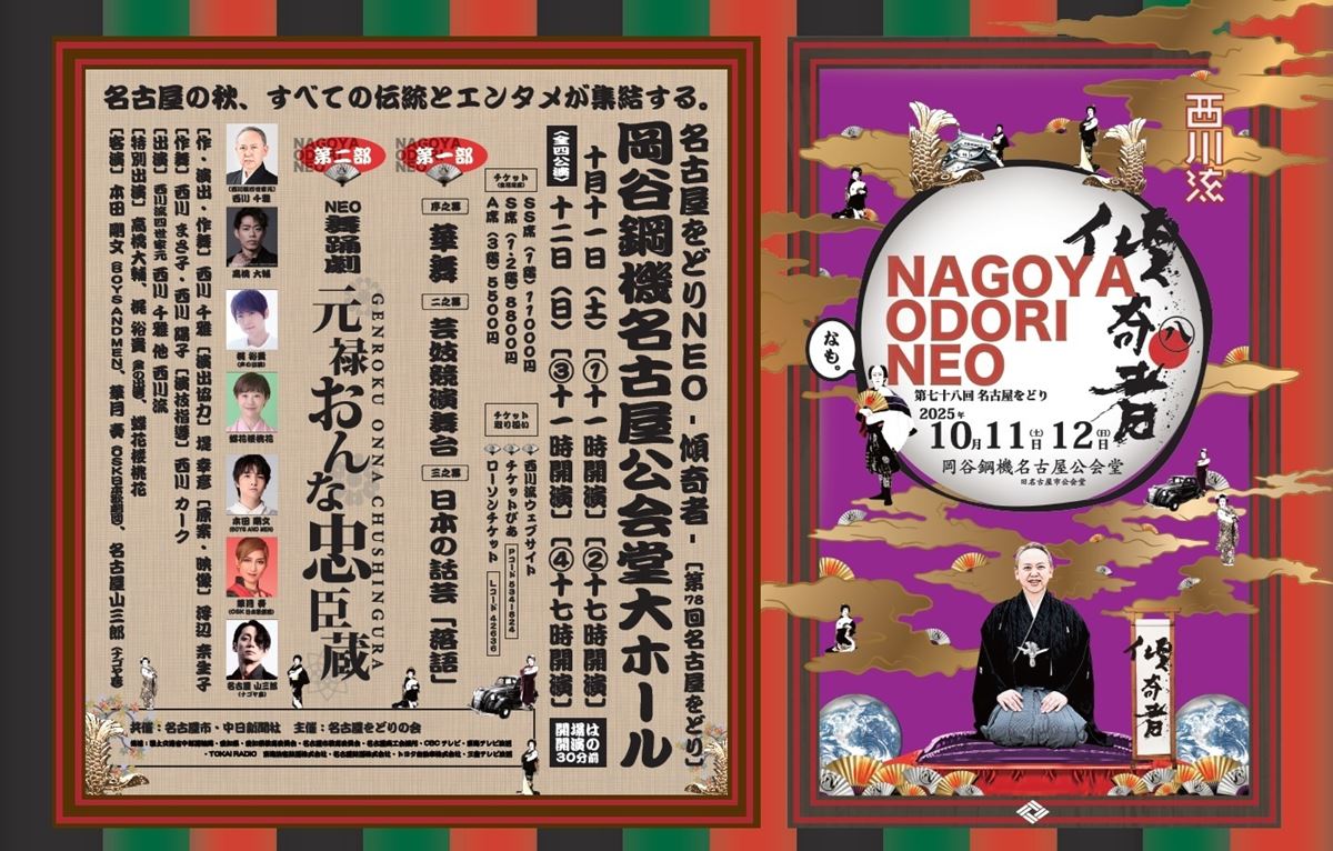名古屋をどりNEO傾奇者(第78回 名古屋をどり) 25/10/11(土)~25/10/12(日) 岡谷鋼機名古屋公会堂 シェア ツイート 上演情報 ジャンル 大・中劇場 車いす席あり。但し、ぴあでの取扱いなし。詳細は問合せ先まで。 料金 SS席-11,000円S席-8,800円A席-5,500円 SS席:1階席S席:1,2階席A席:3階席 表示できるチケット情報はありません詳しくはこちら キャスト&スタッフ 出演 西川千雅 ゲスト 高橋大輔 梶裕貴 蝶花楼桃花 本田剛文 華月奏 名古屋山三郎 手嶋政夫 福島彩菜 [出演]西川千雅 [ゲスト]高橋大輔 / 梶裕貴(声のみ) / 蝶花楼桃花 / 本田剛文 / 華月奏 / 名古屋山三郎 / 手嶋政夫 / 福島彩菜 お問い合わせ 名古屋をどり事務所 公式サイト シェア ツイート
