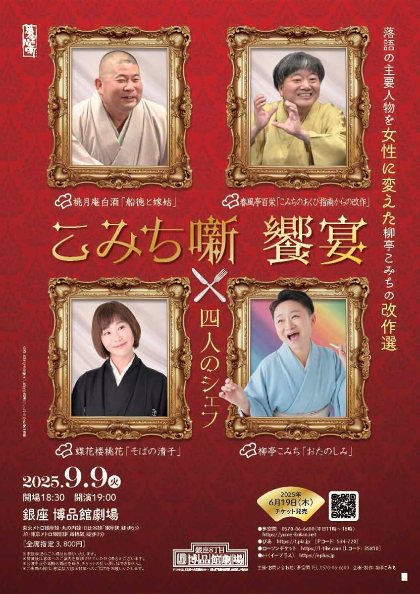 こみち噺 饗宴~四人のシェフ~ 25/9/9(火) 博品館劇場 シェア ツイート 上演情報 ジャンル 落語/演芸 公演中止や延期の場合を除き、チケットの払い戻しはできません。ご来場の際は、感染防止対策へのご協力をお願いいたします。開演後は客席へのご案内を制限させていただく場合がございます。 料金 一般-3,800円 全席指定未就学児童は入場不可 表示できるチケット情報はありません詳しくはこちら キャスト&スタッフ 出演 桃月庵白酒 春風亭百栄 蝶花楼桃花 柳亭こみち [出演]桃月庵白酒 / 春風亭百栄 / 蝶花楼桃花 / 柳亭こみち お問い合わせ 夢空間 公式サイト シェア ツイート