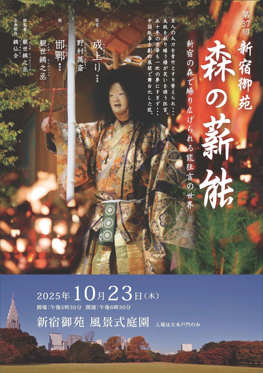 第37回 新宿御苑森の薪能 25/10/23(木) 新宿御苑 風景式庭園 シェア ツイート すべての写真(2)を見る すべての写真(2)を見る 上演情報 ジャンル 能/狂言 雨天時は中止(最終決定時刻 当日13:00)。チケットは後日払い戻し。当日13:00の新宿御苑開催での公演決定後、荒天等により中止の場合の払い戻し不可。 料金 S席-11,000円 A席-9,000円 B席-6,000円 未就学児童は入場不可車いすの方はチケット購入前に問合せ先まで要連絡 表示できるチケット情報はありません詳しくはこちら キャスト&スタッフ 出演 野村萬斎 観世銕之丞 [出演]野村萬斎 / 観世銕之丞 / 他 お問い合わせ 新宿観光振興協会 公式サイト シェア ツイート