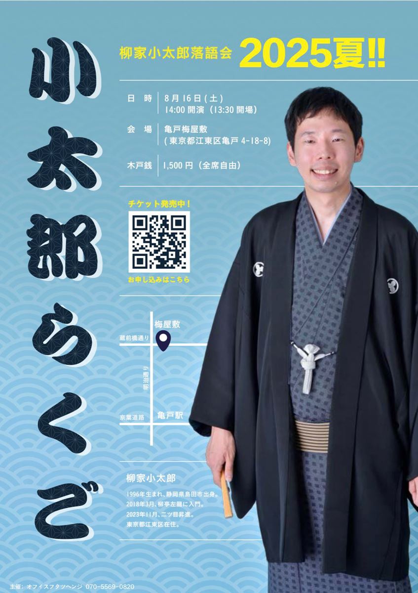 柳家小太郎落語会「小太郎らくご 2025夏!!」 25/8/16(土) 亀戸梅屋敷 シェア ツイート 上演情報 ジャンル 落語/演芸 料金 全席指定:1,500円 キャスト&スタッフ 柳家小太郎 お問い合わせ 問い合わせ 公式サイト シェア ツイート