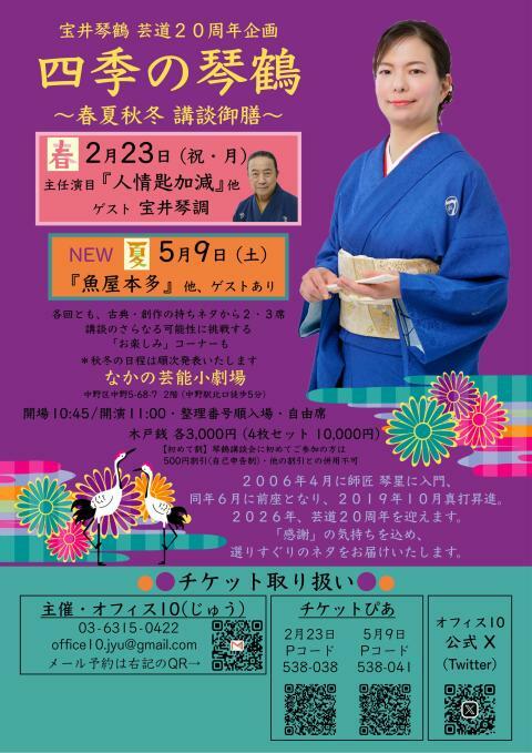 宝井琴鶴20周年企画 四季の琴鶴 春『人情匙加減』他 ゲスト琴調 26/2/23(月) なかの芸能小劇場 シェア ツイート 「宝井琴鶴 芸道20周年企画 四季の琴鶴 ~春夏秋冬 講談御膳~」を年4回に分けて開催いたします! 上演情報 ジャンル 落語/演芸 チケットに記載の整理番号順に入場で、自由席となります。割引チケットはオフィス10のみで販売。 料金 整理番号付自由席-3,000円 表示できるチケット情報はありません詳しくはこちら キャスト&スタッフ 出演 宝井琴鶴 宝井琴調 [出演]宝井琴鶴 / 宝井琴調 お問い合わせ オフィス10(じゅう) シェア ツイート