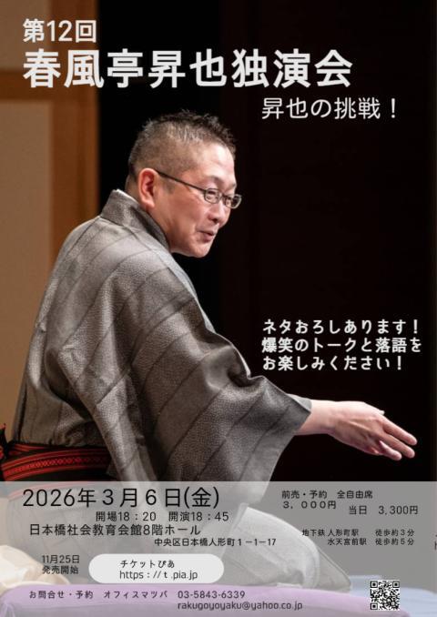 第12回 春風亭昇也独演会 昇也の挑戦! 26/3/6(金) 日本橋社会教育会館 シェア ツイート 人気の噺家 春風亭昇也のホール落語会です。 上演情報 ジャンル 落語/演芸 当日3300円 中止延期以外の払い戻しはおこなっておりませんので、ご了承の上、ご購入ください。 料金 全席自由-3,000円 表示できるチケット情報はありません詳しくはこちら キャスト&スタッフ 出演 春風亭昇也 [出演]春風亭昇也 お問い合わせ オフィスマツバ シェア ツイート