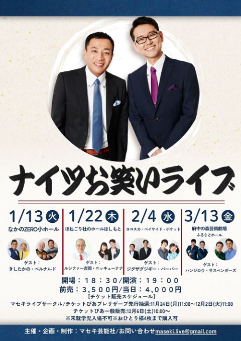 ナイツお笑いライブ 26/1/13(火)~26/5/29(金) なかのZERO 小ホール、ほねごり杜のホールはしもと、ヨコスカ・ベイサイド・ポケット、府中の森芸術劇場 ふるさとホール シェア ツイート すべての写真(2)を見る すべての写真(2)を見る 上演情報 ジャンル お笑い チケットの払い戻しは一切出来かねます。 料金 一般-3,500円 全席指定当日+500円未就学児童入場不可車いすの方は問い合わせ先まで要事前連絡 表示できるチケット情報はありません詳しくはこちら キャスト&スタッフ 出演 ナイツ きしたかの ベルナルド ルシファー吉岡 ニッキューナナ ジグザグジギー パーパー ハンジロウ サスペンダーズ フランツ 銀仁朗 ハギノリザードマン リップグリップ 中津川弦 カナメストーン ※公演日時によって出演者がことなります、詳細は公式サイトをご確認ください お問い合わせ マセキ芸能社 マセキライブ 11:00~18:00・土日祝休 公式サイト シェア ツイート