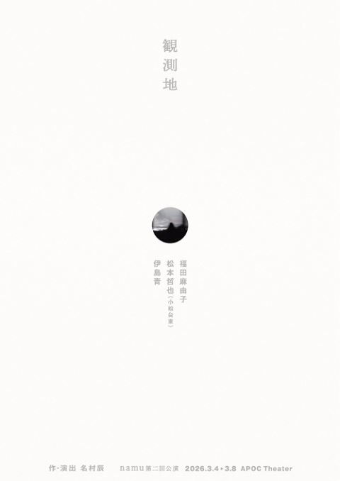 namu第二回公演 『観測地』 26/3/4(水)~26/3/8(日) APOCシアター シェア ツイート すべての写真(3)を見る NHK連続テレビ小説「虎に翼」の小橋浩之役で好評を得た俳優・名村辰によるソロユニットの第二回公演。 すべての写真(3)を見る 上演情報 ジャンル 大・中劇場 車いすでご来場のお客様は、チケットご購入後、お問い合わせ先までご連絡ください。公式サイトにて最新情報をご確認の上、ご来場下さい。公演内容に関する詳細はnamuplaynamu@gmail.comまで。 料金 一般-3,800円 U25-3,000円 ペア割-3,500円 未就学児童入場不可U25-要年齢確認証提示ペア割-1名分/2枚単位での販売。別姓、年齢、性別不問 表示できるチケット情報はありません詳しくはこちら キャスト&スタッフ 作 名村辰 演出 名村辰 出演 福田麻由子 松本哲也 伊島青 [作]名村辰 [演出]名村辰 [出演]福田麻由子 / 松本哲也 / 伊島青 公式サイト シェア ツイート