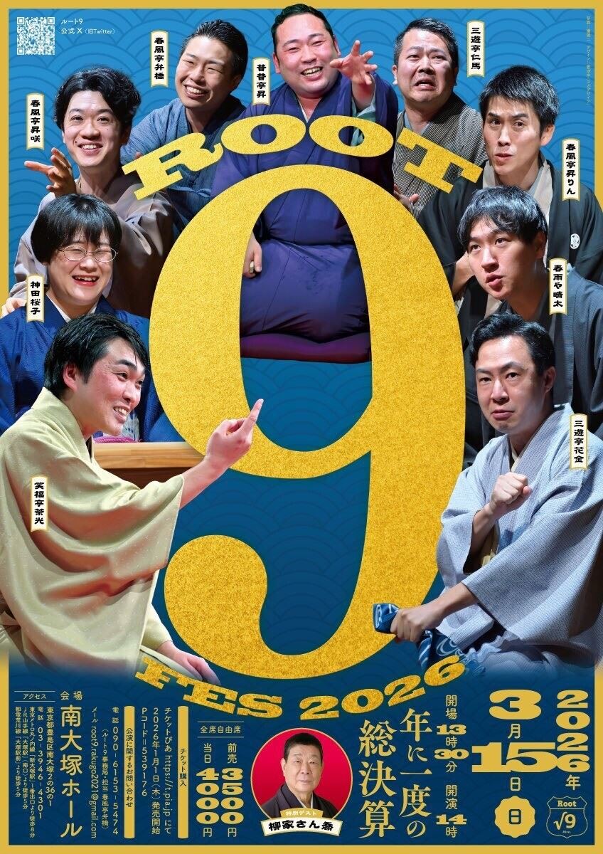 ルート9FES .2026 26/3/15(日) 南大塚ホール シェア ツイート 落語芸術協会所属、落語家と講談師の9人組ユニット『ルート9』年に一度、ゲストを迎えての大イベント。 上演情報 ジャンル 落語/演芸 料金 全席自由-3,500円 表示できるチケット情報はありません詳しくはこちら キャスト&スタッフ 出演 春風亭弁橋 笑福亭茶光 春雨や晴太 三遊亭花金 神田桜子 三遊亭仁馬 春風亭昇りん 昔昔亭昇 春風亭昇咲 柳家さん喬 お問い合わせ ルート9事務局(担当 弁橋) シェア ツイート