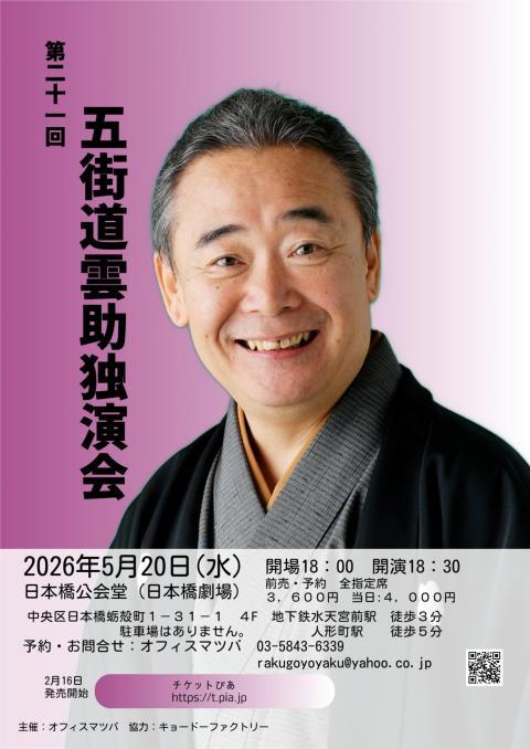 第21回 五街道雲助独演会 26/5/20(水) 日本橋公会堂(日本橋劇場) シェア ツイート 人間国宝 五街道雲助の独演会です 上演情報 ジャンル 落語/演芸 当日4000円 中止延期以外の払い戻しはおこなっておりませんので、ご了承の上、ご購入ください。 料金 全席指定-3,600円 表示できるチケット情報はありません詳しくはこちら キャスト&スタッフ 出演 五街道雲助 [出演]五街道雲助 お問い合わせ オフィスマツバ シェア ツイート