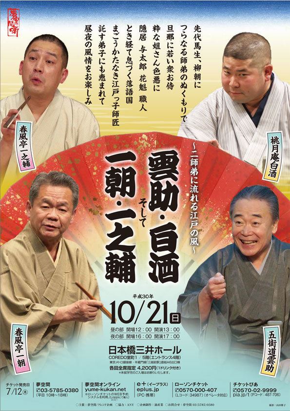 雲助・白酒、一朝・一之輔 二師弟に流れる江戸の風 18/10/21(日) 日本橋三井ホール シェア ツイート 上演情報 ジャンル 落語/演芸 料金 全席指定-4,200円(1ドリンク付) ※未就学児童は入場不可。 表示できるチケット情報はありません詳しくはこちら キャスト&スタッフ 出演 五街道雲助 春風亭一朝 桃月庵白酒 春風亭一之輔 お問い合わせ 夢空間 シェア ツイート