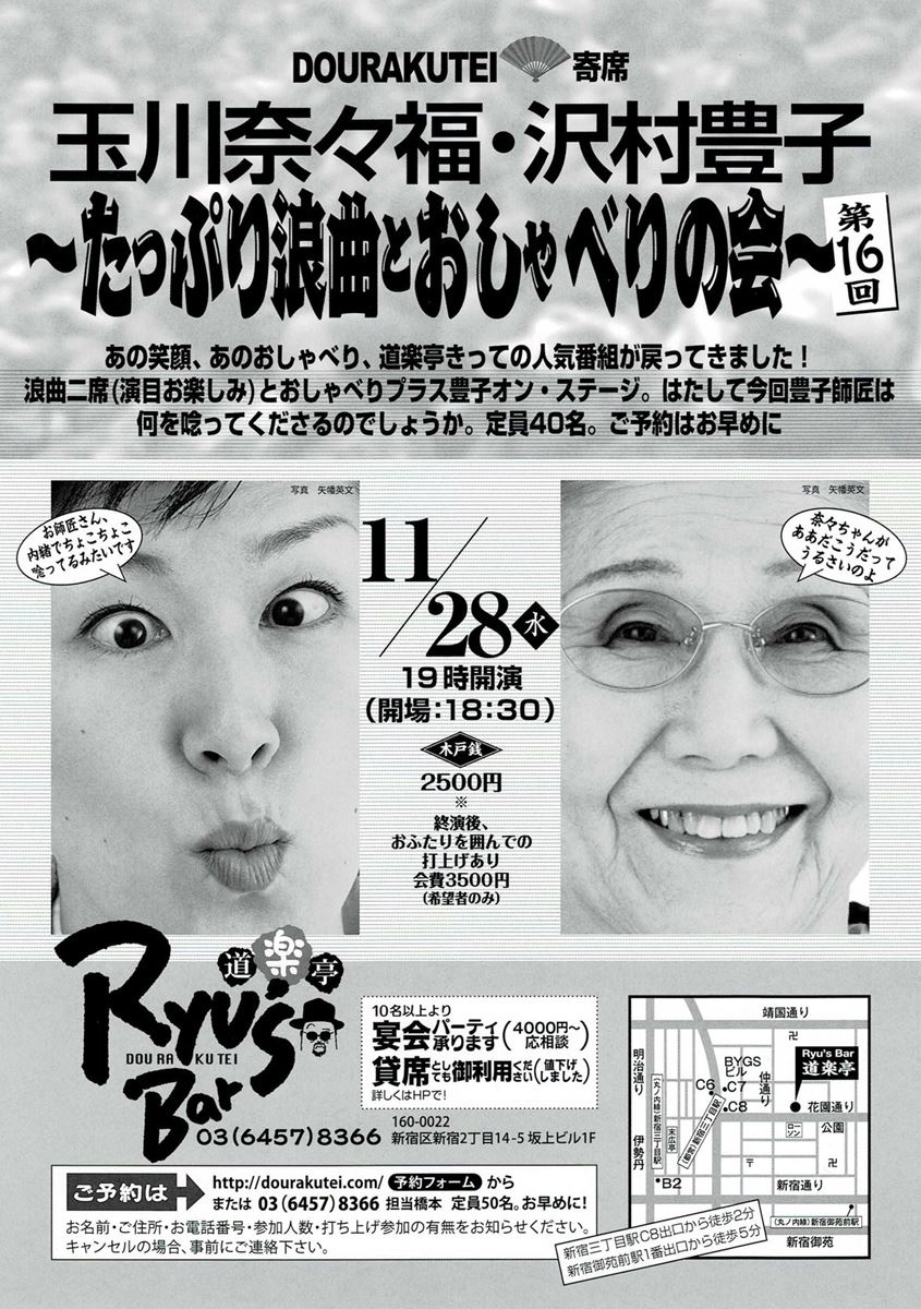 奈々福・沢村豊子 「たっぷり浪曲とおしゃべりの会」第16回 18/11/28(水) 道楽亭(Ryu's Bar) シェア ツイート 上演情報 ジャンル 落語/演芸 料金 2500円 ※終演後打上げあり(会費3500円/希望者のみ)。 キャスト&スタッフ 出演 玉川奈々福 沢村豊子 お問い合わせ 道楽亭 公式サイト シェア ツイート