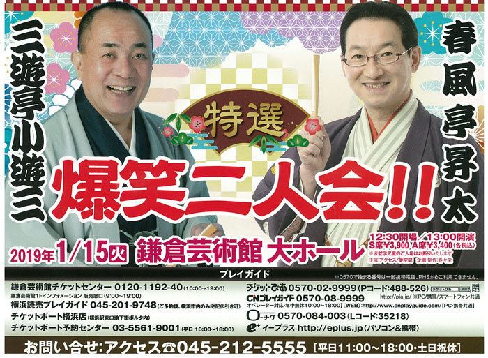 【鎌倉】小遊三・昇太 特選爆笑二人会!! 19/1/15(火) 鎌倉芸術館 大ホール シェア ツイート 上演情報 ジャンル 落語/演芸 料金 S席-3,900円 A席-3,400円 ※未就学児童は入場不可。 表示できるチケット情報はありません詳しくはこちら キャスト&スタッフ メイン 三遊亭小遊三 春風亭昇太 お問い合わせ アクセス シェア ツイート
