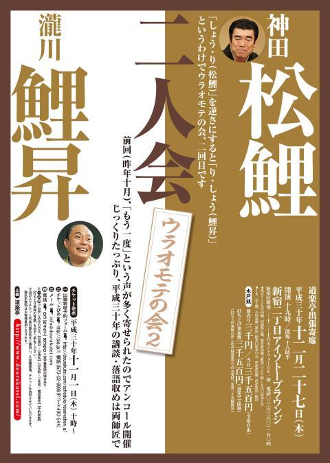 神田松鯉・瀧川鯉昇二人会「ウラオモテの会2」 18/12/27(木) AiSOTOPE LOUNGE シェア ツイート 上演情報 ジャンル 落語/演芸 料金 自由席-3,000円 ※ドリンク代(500円)別途必要。 表示できるチケット情報はありません詳しくはこちら キャスト&スタッフ 出演 神田松鯉 瀧川鯉昇 お問い合わせ 道楽亭 シェア ツイート
