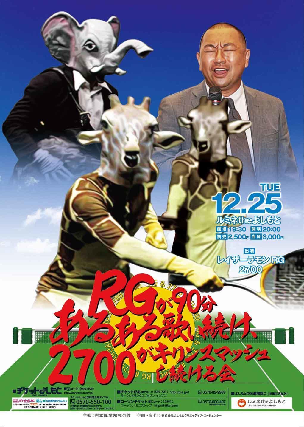 RGが90分あるある歌い続け、2700がキリンスマッシュし続ける会 18/12/25(火) ルミネtheよしもと シェア ツイート 上演情報 ジャンル お笑い 料金 全席指定-2,500円 4歳以下かつ身長110cm以下は膝上無料。 表示できるチケット情報はありません詳しくはこちら キャスト&スタッフ レイザーラモンRG [出演]レイザーラモンRG / 2700 お問い合わせ チケットよしもと予約問合せダイヤル 公式サイト シェア ツイート
