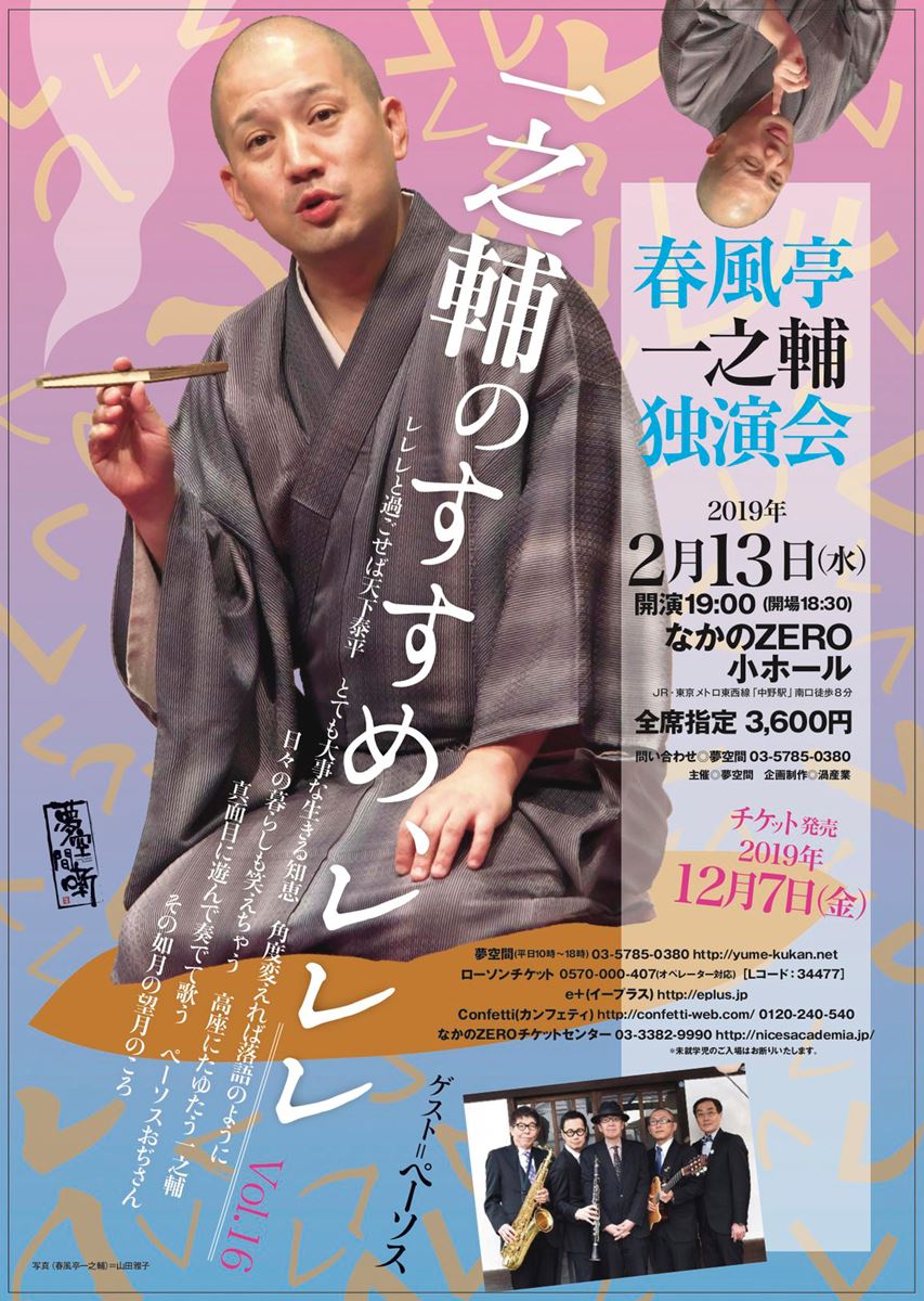 春風亭一之輔独演会 一之輔のすすめ、レレレ~Vol.16 19/2/13(水) なかのZERO 小ホール シェア ツイート 上演情報 ジャンル 落語/演芸 料金 【全席指定】3,600円 キャスト&スタッフ 出演 春風亭一之輔 ゲスト ペーソス お問い合わせ 夢空間 公式サイト シェア ツイート