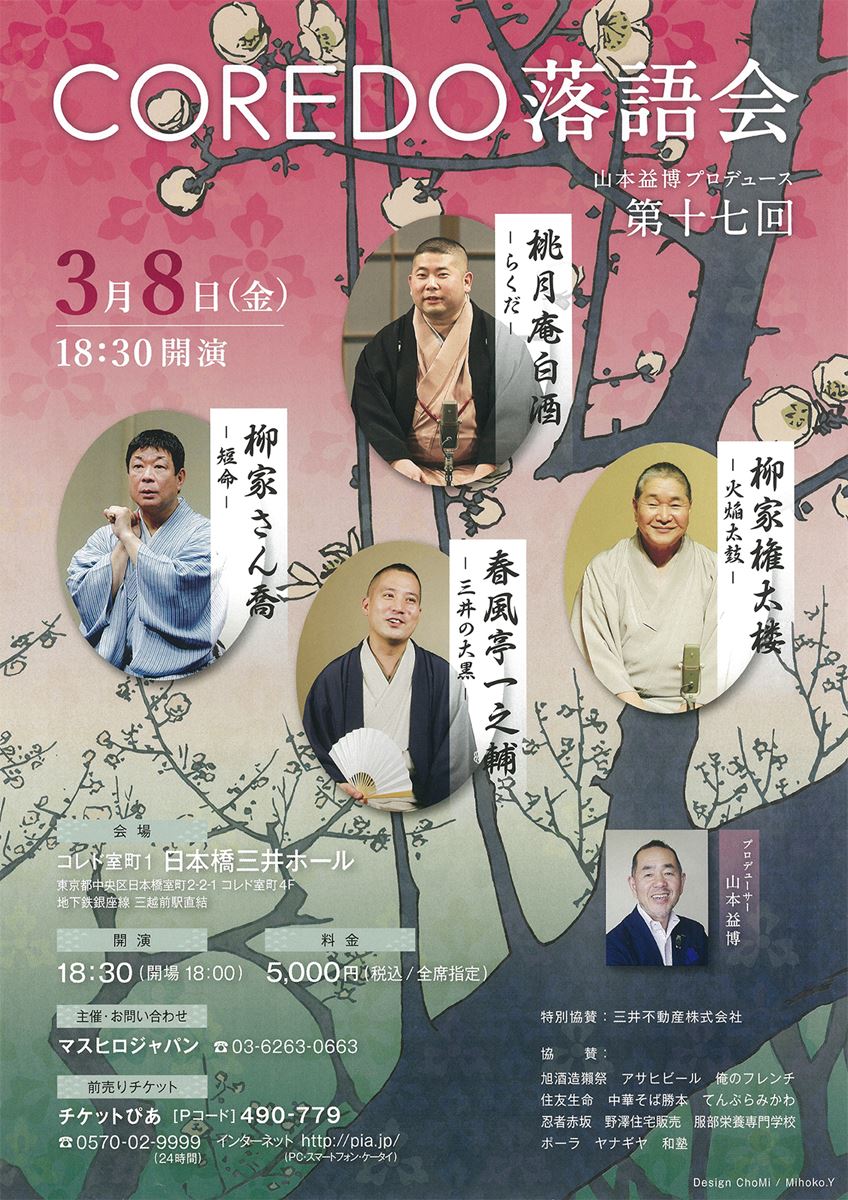 さん喬・白酒・一之輔 COREDO落語会 第17回 19/3/8(金) 日本橋三井ホール シェア ツイート 上演情報 ジャンル 落語/演芸 【演目】 柳家権太楼 「火焔太鼓」 柳家さん喬 「短命」 桃月庵白酒 「らくだ」 春風亭一之輔 「三井の大黒」 料金 【全席指定】5,000円 表示できるチケット情報はありません詳しくはこちら キャスト&スタッフ 出演 柳家権太楼 柳家さん喬 桃月庵白酒 春風亭一之輔 お問い合わせ マスヒロジャパン シェア ツイート