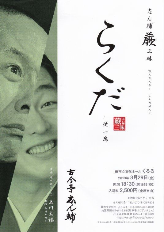 志ん輔 蕨三昧 らくだ 19/3/29(金) 蕨市立文化ホール くるる シェア ツイート 上演情報 ジャンル 落語/演芸 【演目】 古今亭志ん輔 「らくだ」ほか一席 玉川太福 「地べたの二人」(浪曲) 料金 【全席自由】2,500円 キャスト&スタッフ 出演 古今亭志ん輔 玉川太福 お問い合わせ 志ん輔の会 公式サイト シェア ツイート