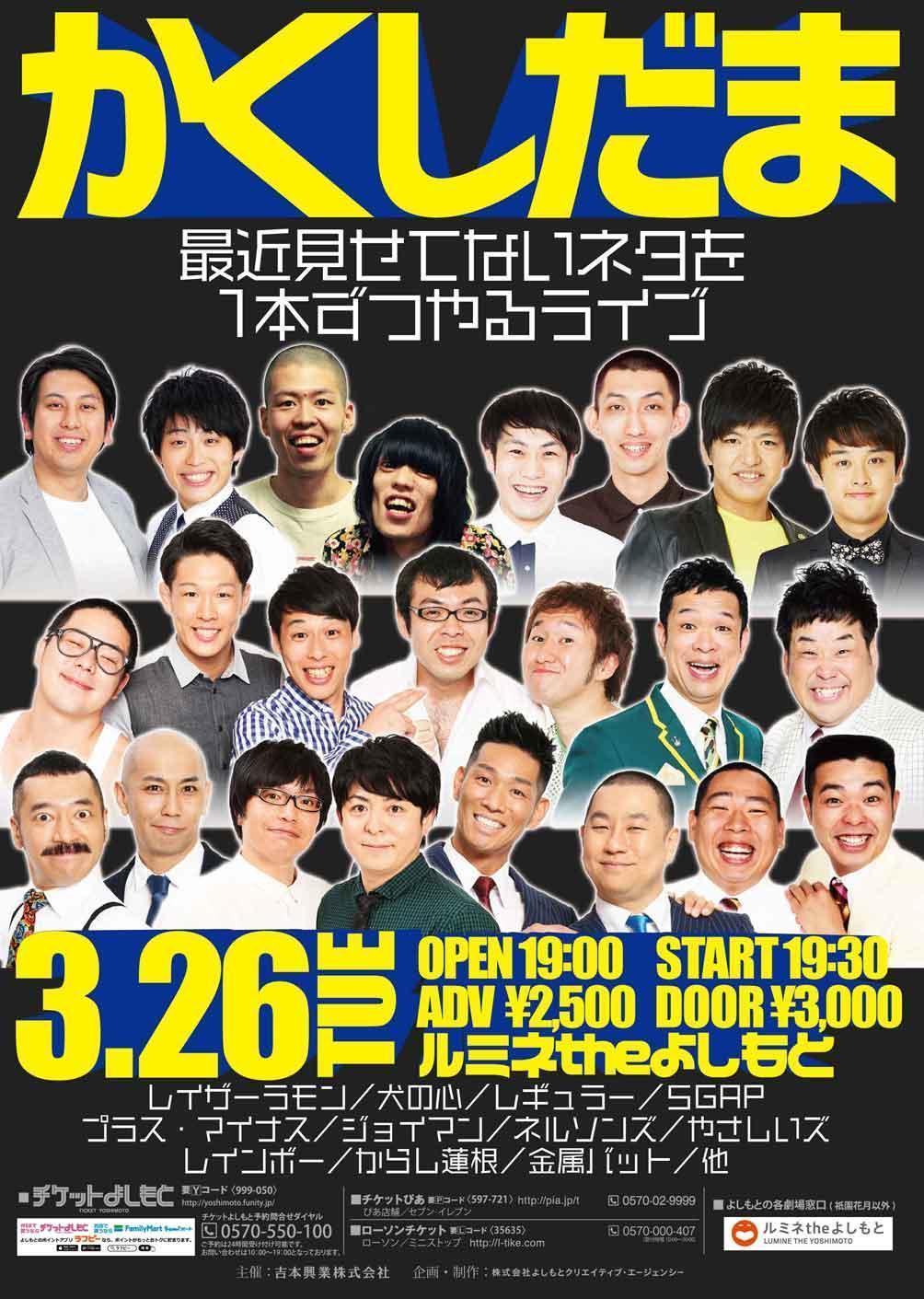 『かくしだま~最近見せてないネタを1本ずつやるライブ~』 ルミネtheよしもと ライブスペシャル 3月 19/3/26(火) ルミネtheよしもと シェア ツイート 上演情報 ジャンル お笑い 上演時間1時間30分予定 料金 前売-2,500円当日-3,000円 4歳以下かつ身長110cm以下は膝上無料。車椅子の方は購入前にチケット問い合わせ先まで要連絡。 キャスト&スタッフ 出演 犬の心 レギュラー レイザーラモン [出演]犬の心 / レギュラー / レイザーラモン / 他 お問い合わせ チケットよしもと予約問合せダイヤル 10:00~19:00 公式サイト シェア ツイート