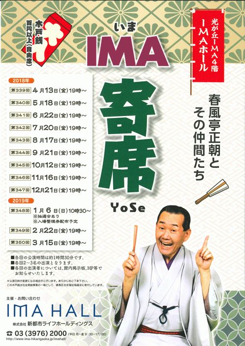第350回 IMA寄席 19/3/15(金) 光が丘IMAホール シェア ツイート 上演情報 ジャンル 落語/演芸 料金 【全席自由】100円以上 ※料金は社会貢献事業の一環として、練馬区社会福祉協議会に寄付。 キャスト&スタッフ 出演 春風亭正朝 お問い合わせ IMAホール 公式サイト シェア ツイート