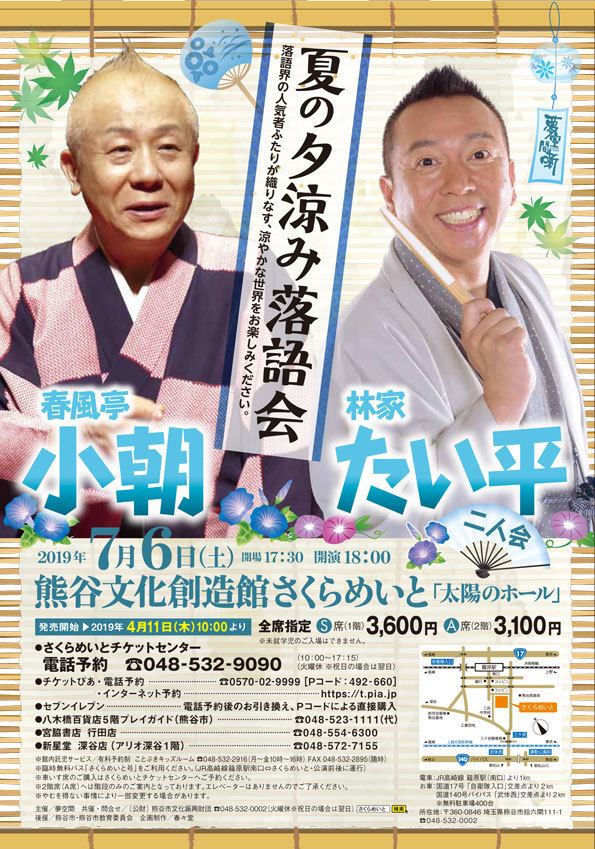 小朝・たい平二人会 19/7/6(土) 熊谷文化創造館(さくらめいと) 太陽のホール シェア ツイート 上演情報 ジャンル 落語/演芸 料金 【全席指定】 S席-3,600円 A席-3,100円 ※未就学児童は入場不可。 表示できるチケット情報はありません詳しくはこちら キャスト&スタッフ メイン 春風亭小朝 林家たい平 お問い合わせ 熊谷市文化振興財団 シェア ツイート