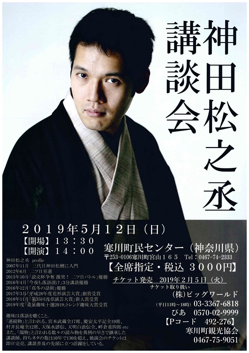神田松之丞 講談会 19/5/12(日) 寒川町民センター シェア ツイート 上演情報 ジャンル 落語/演芸 料金 【全席指定】3,000円 表示できるチケット情報はありません詳しくはこちら キャスト&スタッフ メイン 神田松之丞 お問い合わせ ビッグワールド シェア ツイート