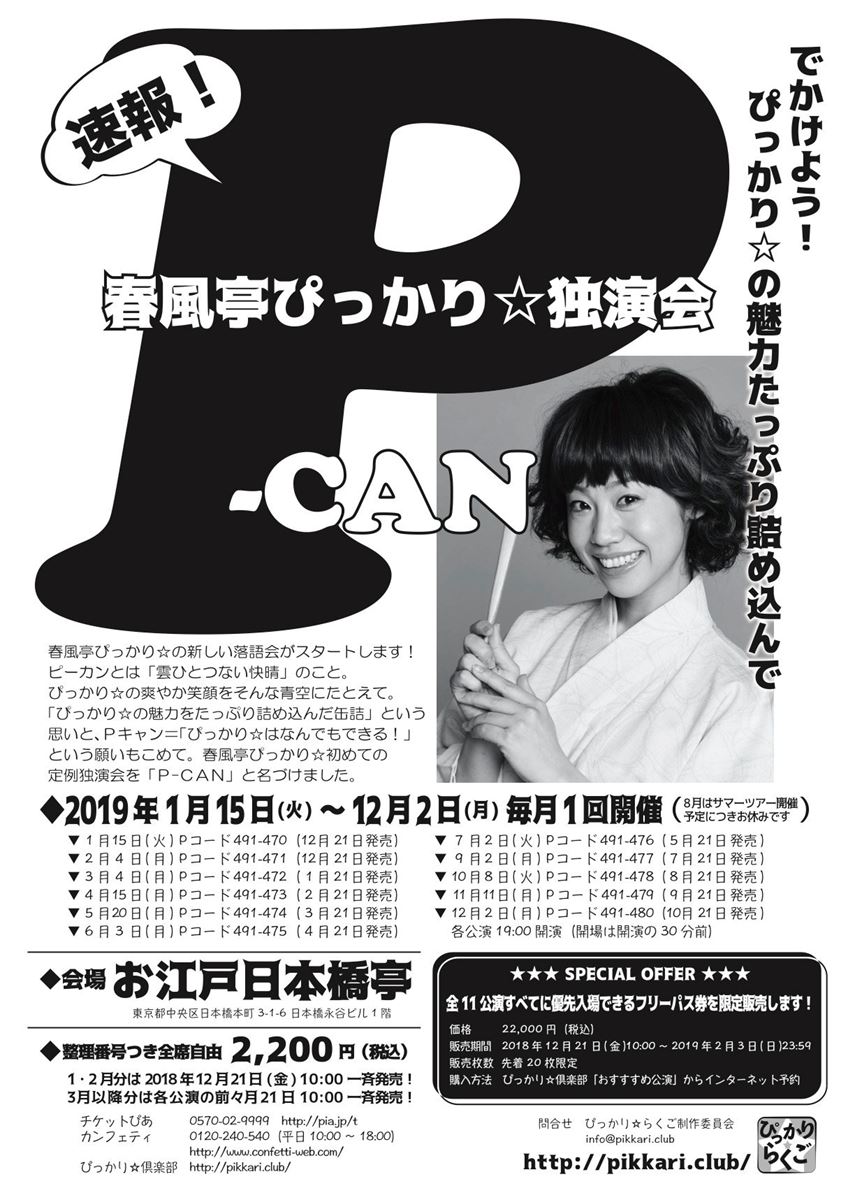 春風亭ぴっかり☆独演会「P-CAN」 19/9/2(月) お江戸日本橋亭 シェア ツイート 上演情報 ジャンル 落語/演芸 料金 【整理番号付自由席】2,200円 ※開場時間より、券面に表示の整理番号順に入場。※未就学児の入場不可。 表示できるチケット情報はありません詳しくはこちら キャスト&スタッフ 出演 蝶花楼桃花 お問い合わせ ぴっかり☆らくご制作委員会 シェア ツイート