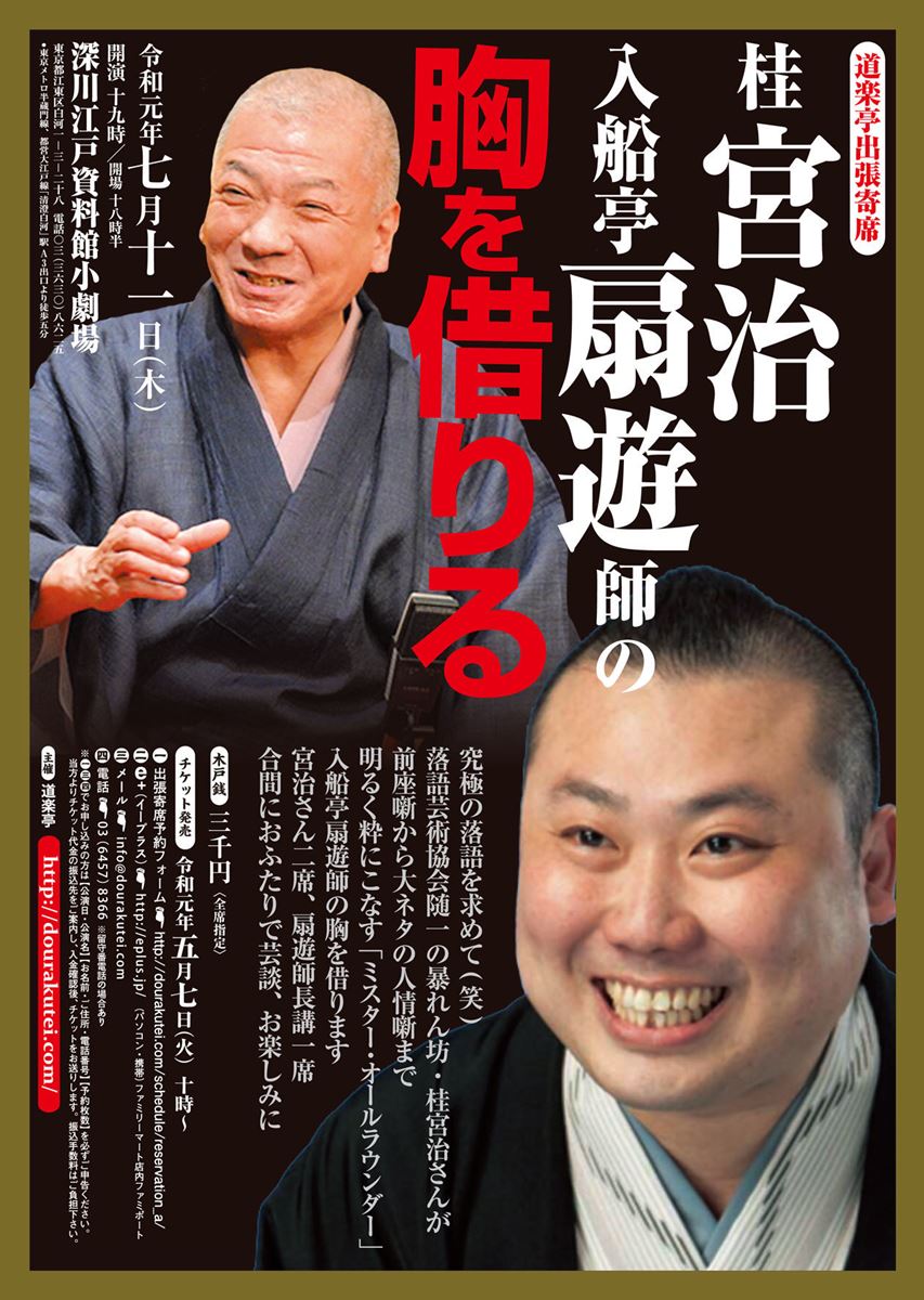 宮治、扇遊師の胸を借りる 19/7/11(木) 深川江戸資料館 小劇場 シェア ツイート 上演情報 ジャンル 落語/演芸 料金 【全席指定】3,000円 キャスト&スタッフ 出演 桂宮治 入船亭扇遊 お問い合わせ 道楽亭 シェア ツイート