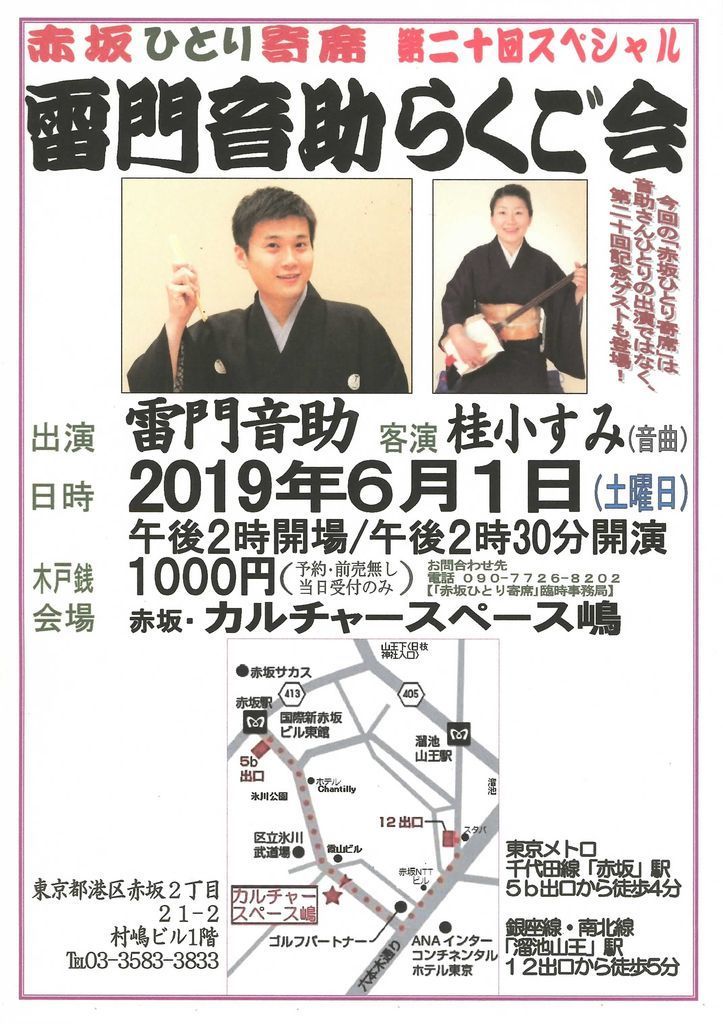 雷門音助らくご会 赤坂ひとり寄席 第二十回スペシャル 19/6/1(土) 赤坂カルチャースペース嶋 シェア ツイート 上演情報 ジャンル 落語/演芸 料金 【全席自由】1,000円 ※当日券のみ キャスト&スタッフ 出演 雷門音助 ゲスト 桂小すみ お問い合わせ 「赤坂ひとり寄席」臨時事務局 シェア ツイート