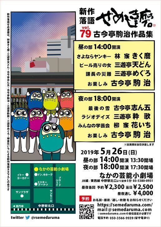 駒治 せめ達磨 新作落語 vol.79 古今亭駒治作品集 19/5/26(日) なかの芸能小劇場 シェア ツイート 上演情報 ジャンル 落語/演芸 【演目】〈昼の部〉 林家きく麿 「さよならヤンキー」 三遊亭天どん 「ビール売りの女」 三遊亭めぐろ 「課長の災難」 古今亭駒治 お楽しみ〈夜の部〉 古今亭志ん五 「最後の雪」 三遊亭粋歌 「ラジオデイズ」 柳家花いち 「みんなの学芸会」 古今亭駒治 お楽しみ 料金 前売-2,300円 当日-2,500円 キャスト&スタッフ 出演 古今亭駒治 林家きく麿 三遊亭天どん 三遊亭れん生 古今亭志ん五 三遊亭粋歌 柳家花いち シェア ツイート