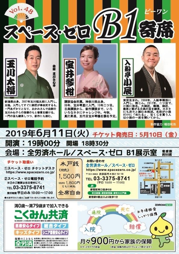 小辰・琴柑・太福 スペース・ゼロB1寄席 Vol.48 19/6/11(火) こくみん共済 coop ホール(全労済ホール)/スペース・ゼロ シェア ツイート 上演情報 ジャンル 落語/演芸 料金 【全席自由】前売-1,500円 当日-1,800円 ※未就学児の入場不可。 キャスト&スタッフ 出演 入船亭小辰 宝井琴柑 玉川太福 お問い合わせ 全労済ホール/スペース・ゼロ 公式サイト シェア ツイート