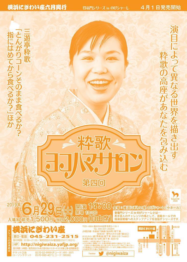 第四回 粋歌ヨコハマサロン 19/6/29(土) 横浜にぎわい座 のげシャーレ(小ホール) シェア ツイート 上演情報 ジャンル 落語/演芸 【日程】 三遊亭粋歌「とんがりコーンそのまま食べるか? 指にはめてから食べるか?」ほか 料金 【全席自由】前売-1,500円 当日-2,000円 ※未就学児の入場不可。 キャスト&スタッフ 出演 三遊亭粋歌 お問い合わせ 横浜にぎわい座 公式サイト シェア ツイート