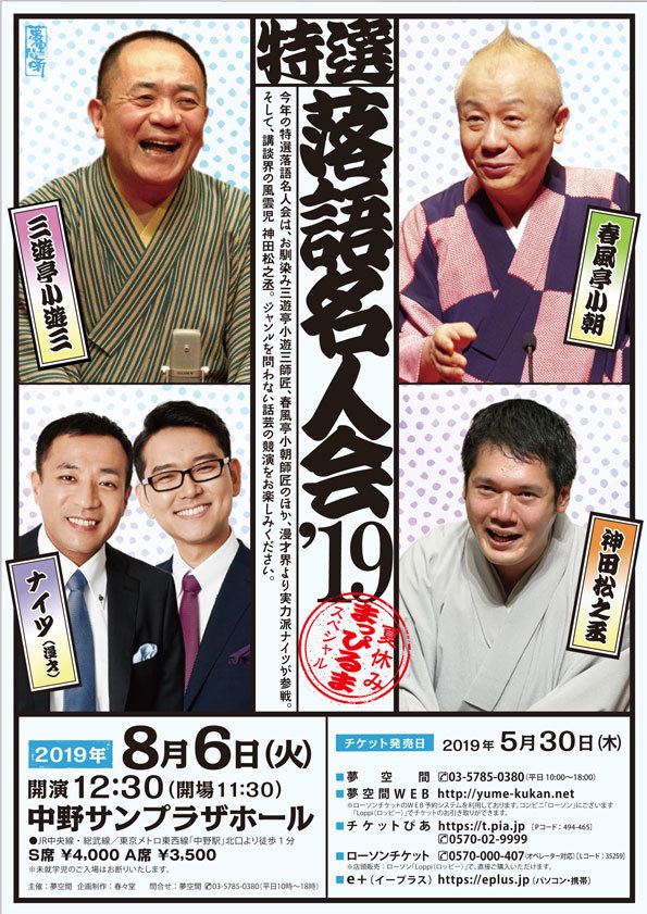小遊三・小朝・ナイツ・松之丞 ~夏休み まっぴるまスペシャル~ 特選落語名人会 '19 19/8/6(火) 中野サンプラザ シェア ツイート 上演情報 ジャンル 落語/演芸 料金 S席-4,000円 A席-3,500円 ※未就学児童は入場不可。 表示できるチケット情報はありません詳しくはこちら キャスト&スタッフ 出演 三遊亭小遊三 春風亭小朝 ナイツ 神田松之丞 お問い合わせ 夢空間 公式サイト シェア ツイート