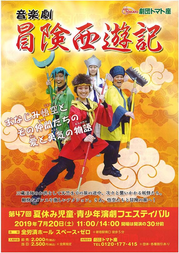 劇団トマト座 音楽劇『冒険西遊記』 2019 夏休み児童青少年演劇フェスティバル 19/7/20(土) こくみん共済 coop ホール(全労済ホール)/スペース・ゼロ シェア ツイート 大人と子供が一緒に楽しめる質の高い舞台づくりを目標に掲げるトマト座の公演。今回は『西遊記』の伝説を取り上げる。孫悟空が三蔵法師の供をして天竺まで旅をする冒険物語。猪八戒・沙悟浄との出逢いと友情、妖怪たちとの激しいアクションを堪能あれ。 上演情報 ジャンル 大・中劇場 料金 前売-2,000円当日-2,500円 全席指定各種割引あり キャスト&スタッフ メイン 劇団トマト座 お問い合わせ 劇団トマト座 劇団トマト座 公式サイト シェア ツイート