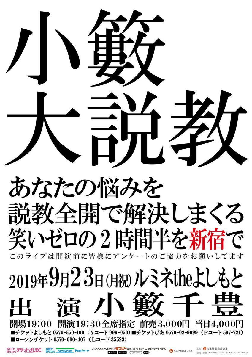 『小籔大説教~あなたの悩みを説教全開で解決しまくる笑いゼロの2時間半を新宿で~』ルミネtheよしもと ライブスペシャル / ワンコインライブ 9月 19/9/23(月) ルミネtheよしもと シェア ツイート 上演情報 ジャンル お笑い 22:00終演予定 料金 前売-3,000円当日-4,000円 全席指定立ち見席あり:詳細は公式サイトをご確認ください当日身分証確認の可能性あり18歳未満入場不可車椅子の方は購入前にチケットよしもと予約問合せダイヤルまで要問合せ 表示できるチケット情報はありません詳しくはこちら キャスト&スタッフ 出演 小籔千豊 [出演]小籔千豊 お問い合わせ チケットよしもと予約問合せダイヤル 10:00~19:00 公式サイト シェア ツイート