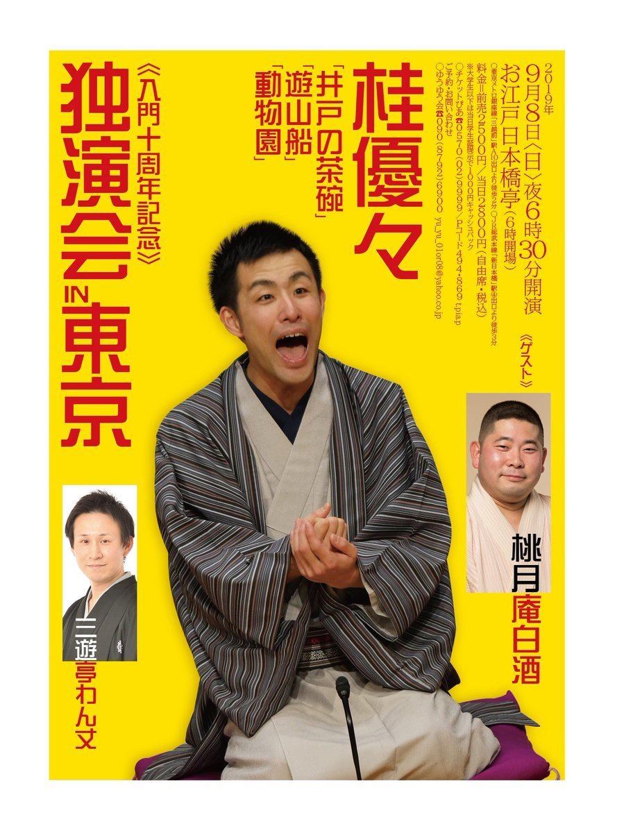 桂優々 入門十周年記念独演会 in 東京 19/9/8(日) お江戸日本橋亭 シェア ツイート 上演情報 ジャンル 落語/演芸 【演目】 桂優々 「田楽喰い」「さぎ取り」「井戸の茶碗」 三遊亭わん丈 「開口一番」 桃月庵白酒(ゲスト) 「お楽しみ」 料金 【全席自由】 前売-2,500円 当日-2,800円 ※公演当日、大学生以下は学生証提示で1000円返金。 表示できるチケット情報はありません詳しくはこちら キャスト&スタッフ 出演 桂優々 三遊亭わん丈 ゲスト 桃月庵白酒 お問い合わせ ゆうゆう会 シェア ツイート
