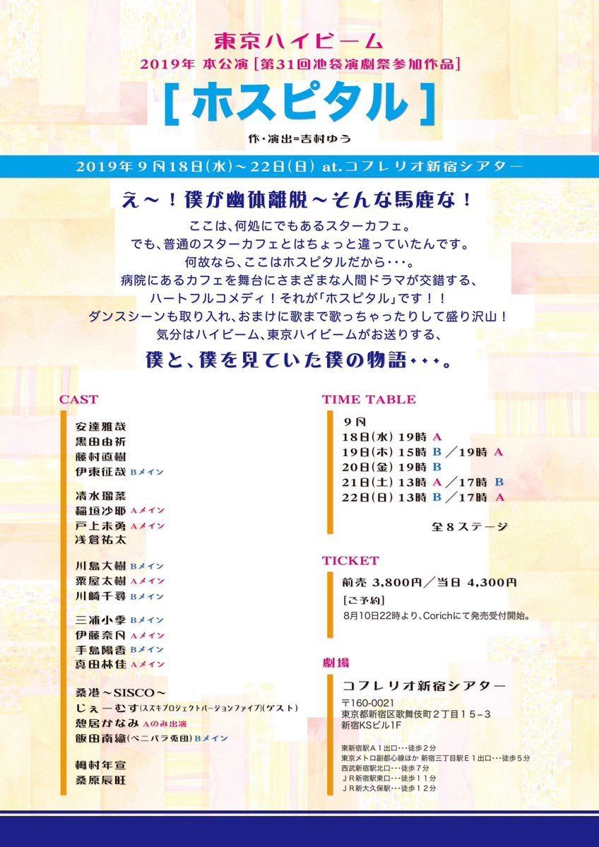 東京ハイビーム『ホスピタル』第31回池袋演劇祭参加作品 19/9/18(水)~19/9/22(日) コフレリオ 新宿シアター シェア ツイート 上演情報 ジャンル 小劇場 料金 前売-3,800円当日-4,300円 キャスト&スタッフ 作・演出 吉村ゆう [作・演出]吉村ゆう [出演]藤村直樹 / 黒田由祈 / 清水瑠菜 / 他※一部Wキャスト。公演日時によって出演者が異なります。詳細は公式サイトをご確認ください。 お問い合わせ 東京ハイビーム 公式サイト シェア ツイート