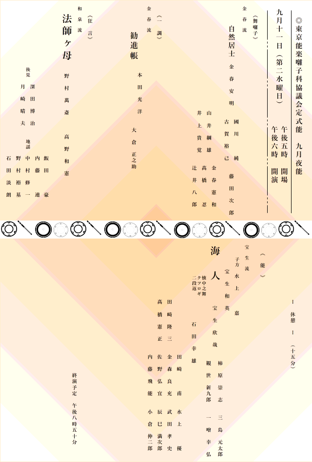 東京能楽囃子科協議会定式能 九月夜能 19/9/11(水) 国立能楽堂 シェア ツイート 上演情報 ジャンル 能/狂言 20:50終演(休憩15分あり)予定 演目舞囃子『自然居士』 一調『勧進帳』狂言『法師ヶ母』能『海人』 料金 指定A席-8,000円指定B席-6,000円学生席-2,500円 学生席:自由席指定A席・指定B席当日+1,000円 キャスト&スタッフ 出演 本田光洋 野村萬斎 宝生和英 宝生欣哉 [出演]金春安町 / 本田光洋 / 野村萬斎 / 水上嘉 / 宝生和英 / 宝生欣哉 / 他 お問い合わせ 東京能楽囃子科協議会 10:00~17:00・土日祝休 東京能楽囃子科協議会 公式サイト シェア ツイート