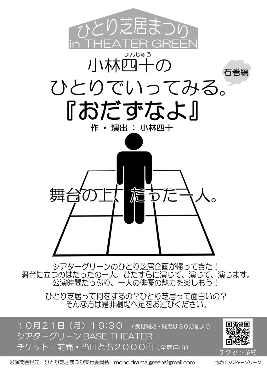 小林四十の(よんじゅう)のひとりでいってみる。~石巻編~『おだずなよ』ひとり芝居まつり実行委員会 19/10/21(月) シアターグリーン BASE THEATER シェア ツイート ひとり芝居を通してさまざまなトライを重ねる小林四十の「ひとりでいってみる」企画。「石巻編」と題して、ひたすらに演じて、演じて、演じきる! 上演情報 ジャンル 小劇場 料金 一般-2,000円 全席自由 キャスト&スタッフ [作・演出]小林四十 お問い合わせ ひとり芝居まつり実行委員会 公式サイト シェア ツイート