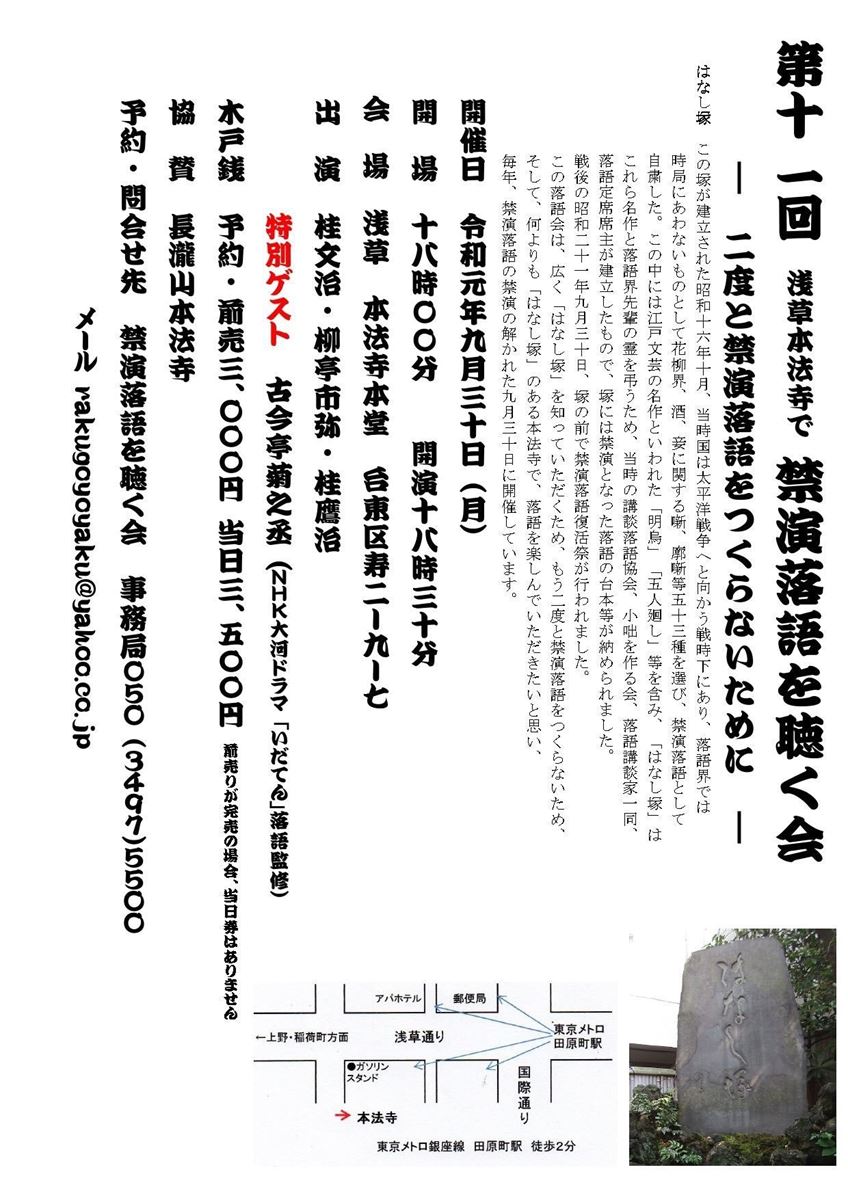 文治・市弥・菊之丞 第十一回 浅草本法寺で禁演落語を聴く会 19/9/30(月) 浅草本法寺本堂 シェア ツイート 上演情報 ジャンル 落語/演芸 料金 前売-3,000円当日-3,500円 キャスト&スタッフ 出演 桂文治 柳亭市弥 桂鷹治 ゲスト 古今亭菊之丞 お問い合わせ オフィスマツバ シェア ツイート